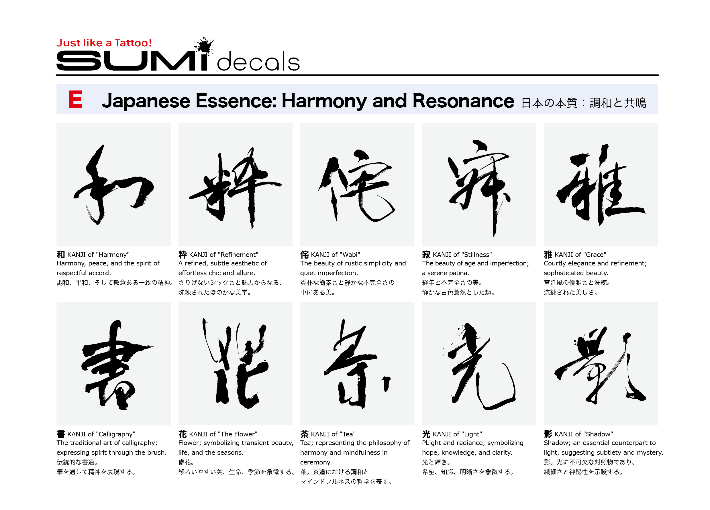 これらの文字を身に纏うことは、日本の優雅で調和のとれた精神を携えることであり、内なる均衡と洗練された簡素美を尊ぶ人々への誘いです。